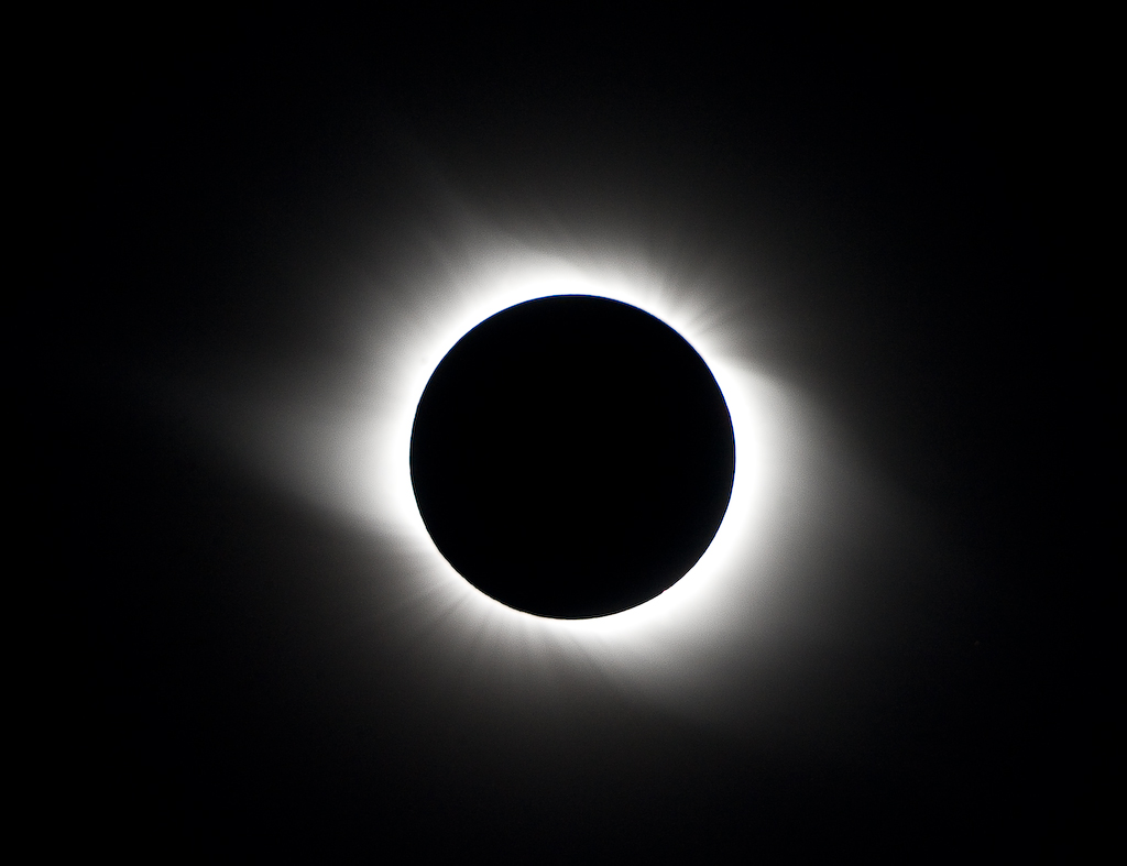 Midpoint of totality. The coronal streamers were much longer along one diagonal axis.